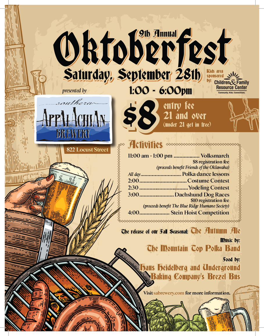6th Annual Dachshund Races – to benefit Blue Ridge Humane Society $10 registration fee (cash or check). Pre-register at Wag! A Unique Pet Boutique or at the brewery and get one free admission to Oktoberfest.