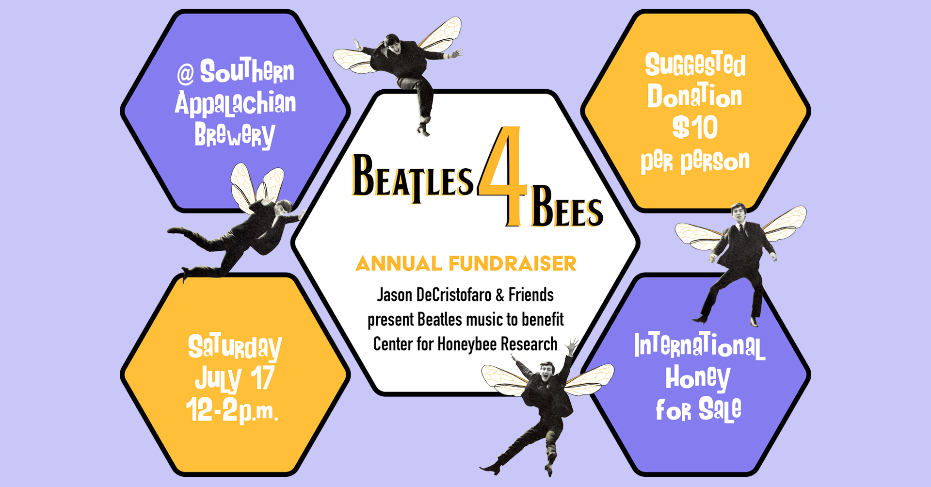 Jason DeCristofaro and Friends present Beatles for Bees, a fundraiser benefiting WNCs Center for Honeybee Research, a non-profit organization educating the public about honeybees and beekeeping, and researching the issues plaguing these beneficial insects.