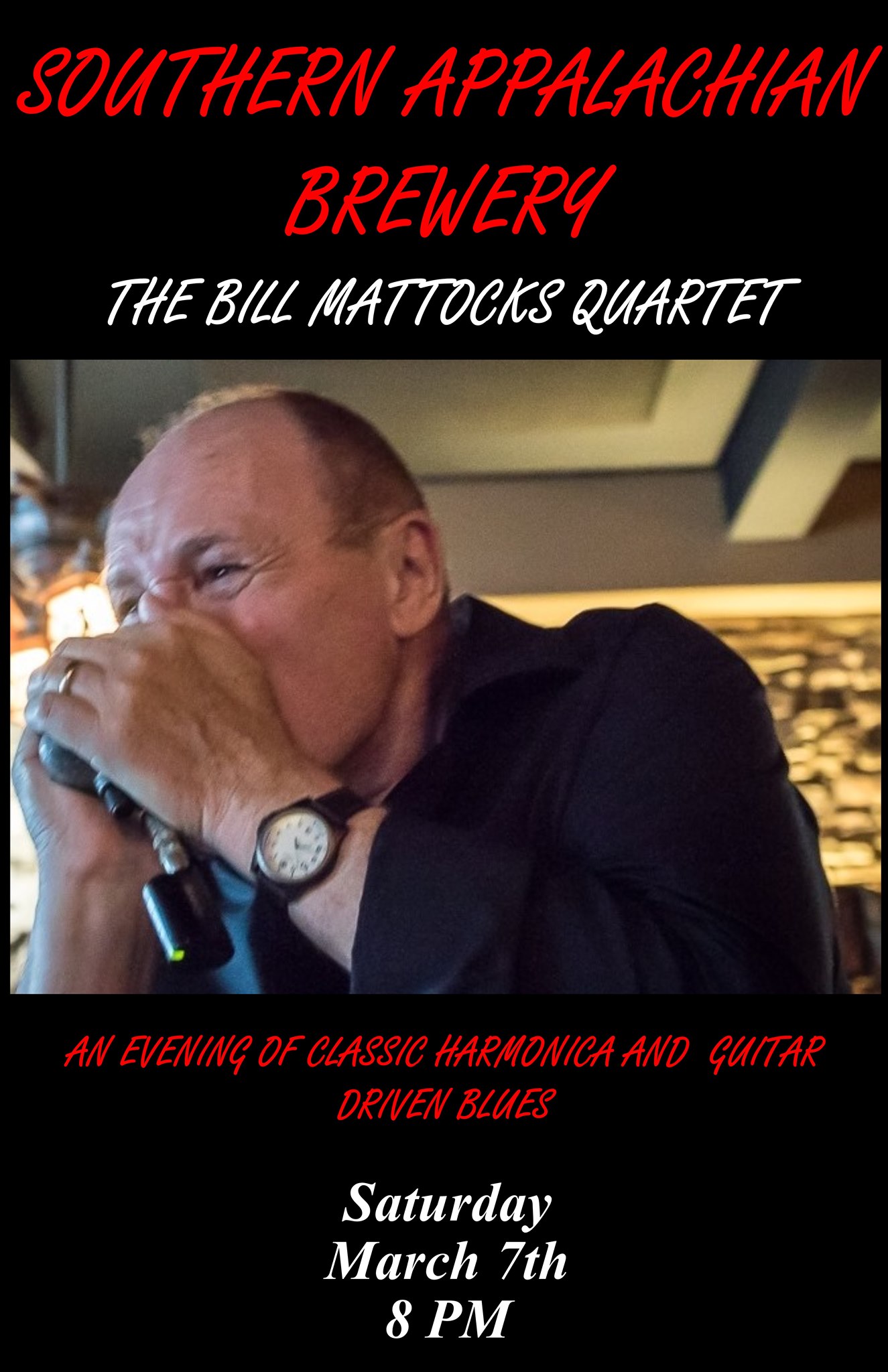 Really looking forward to bringing my Quartet back to Southern Appalachian Brewery on Saturday March 7th. This music project is an offshoot of what I do when I go on tour and is centered around Harmonica driven Blues. Featuring longtime Hendersonville/ Brevard guitar ace Howie Johnson who’s skill on both standard and slide guitar is well known. Pretty good singer too! Rhythm section for my Quartet is Tim McCall on Bass, Tim is known for his Bass duties in Bill Mattocks and The Strut and his recent Guitar work with the Rich Nelson Band out of Tryon. Marc Friedlander will be rounding out the Quartet on drums…Marc also plays in The Strut, The Blake Ellege Band and a few other projects around the area…He is much in demand and I’m happy to have him on board with my Project. I sure hope you will take the time to come see The Bill Mattocks Quartet on Saturday March 7th at one of the best small venues in Western North Carolina…Southern Appalachian Brewery! Downbeat is 8pm.